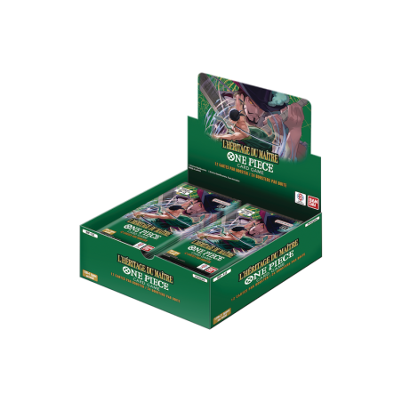 Display One Piece OP12 L'Héritage du Maître. Cette 12ème série qui fête les 3 ans du JCC One Pieces contient 24 boosters de 12 cartes ! Les plus de cet OP12 : Une extension marquant les 3 ans du One Piece Card Game, Apparition de Rayleigh, le Roi des Ténèbres, en carte spéciale, Nouvelles mécaniques et effets pour renouveler la méta, Contient 2 cartes spéciales 3e anniversaire exclusives
