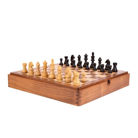 Coffret d'échecs magnétique Deluxe New Standard 35cm (Taille 4). Ce magnifique coffret d'échecs est un ensemble parfait qui combine esthétique, modernité et praticité. Le set comprend 34 pièces d'échecs magnétiques en bois (32 pièces + 2 dames supplémentaires) avec un design épuré qui plaira à tous les joueurs. Le plateau amovible est magnétique pour une meilleure stabilité et peut se poser sur le socle de rangement mais également directement sur une table selon vos préférences. Le format de ce coffret est suffisamment compact pour trouver une place de choix dans votre intérieur sans pour autant occuper trop d'espace.