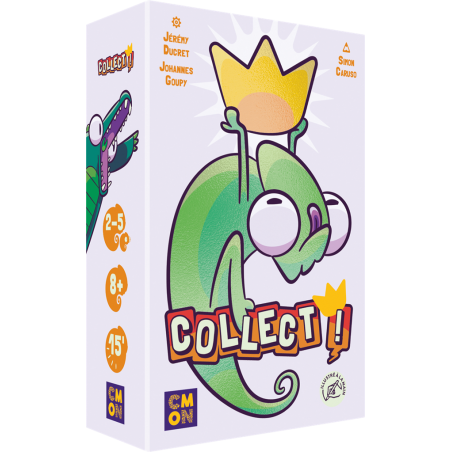 4 cartes identiques adjacentes vous permet de vous emparer d’une demi-couronne ou de la couronne complète. Certaines capacités offrent aussi des victoires surprises. Rapide, interactif et plein de rebondissements, Collect ! mêle prise de risque, lecture du jeu adverse et sens du timing. Un jeu de cartes tactique idéal pour s'amuser en famille, qui vous propose aussi un mode "en équipe" : les partenaires assis face à face visent ensemble 2 demi-couronnes ou la couronne complète pour remporter la partie.