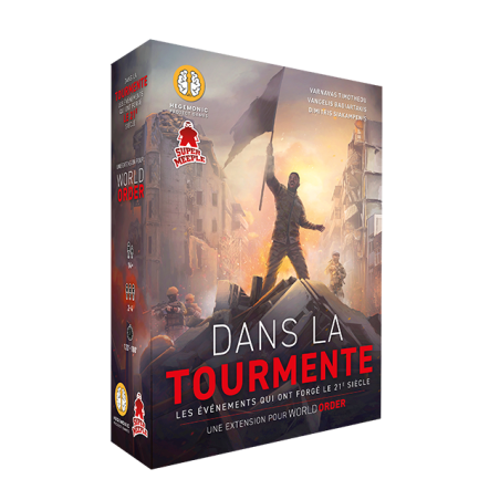 World Order - Extension dans la Tourmente. Le monde est en pleine tourmente. Des conflits régionaux, des alliances changeantes et de nouveaux accords économiques menacent l’équilibre des forces politiques sur la planète. En cette période incertaine, parviendrez-vous à mener votre puissance à l’hégémonie mondiale ? Dans la tourmente vous propose 60 cartes Événement tirées de la vie réelle, dont les conséquences ont redessiné le paysage géopolitique depuis 2010. Affrontez les retombées du Printemps arabe, vivez les conséquences du Brexit et de la guerre commerciale entre les États-Unis et la Chine, et répondez aux défis que représentent la montée de l’État Islamique, la pandémie de COVID-19 et l’invasion de l’Ukraine par la Russie. Avec cette extension, vous devrez répondre à des menaces, identifier des opportunités et simuler les scénarios de la vie réelle en réfléchissant soigneusement à vos décisions pour guider votre puissance à travers les courants changeants d’un nouvel ordre mondial.