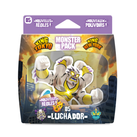 Incarnez Luchador, le combattant le plus redoutable de toute la planète ! Rien ne l’arrêtera dans sa course pour devenir le King of Tokyo ! Pendant la mise en place, chaque joueur reçoit un Masque qu’il attache à sa figurine de Monstre. Mélangez les cartes Challenge et formez une pioche face cachée. Chaque joueur en pioche ensuite une, qu’il regarde secrètement et conserve devant lui également face cachée.
