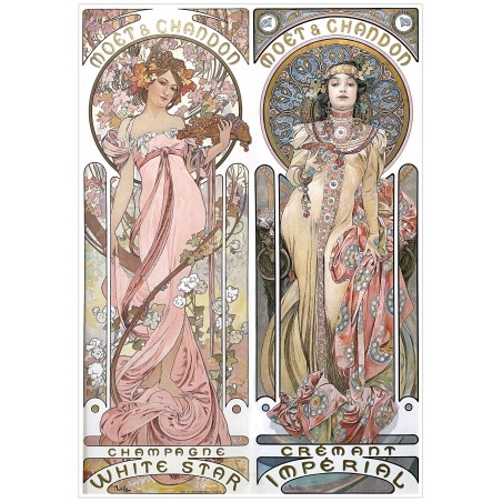 Alfons Mucha est un peintre et illustrateur tchèque, chef de file du mouvement Art nouveau. Ces deux affiches publicitaires aux couleurs douces et aux motifs fins et travaillés font partie d'une série conçue pour le producteur de champagne Moët & Chandon en 1899.