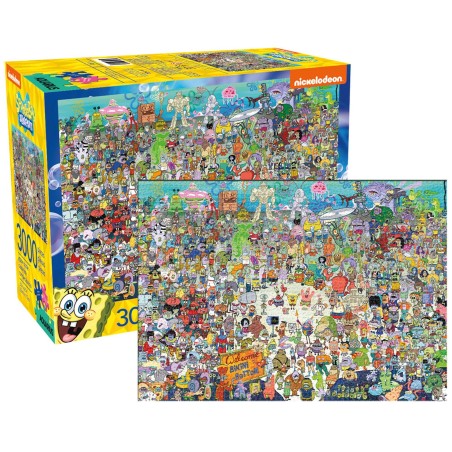 Puzzle 3000 pièces - Bob l'Eponge Bikini Bottom. Puzzle avec le casting de Bob l'Eponge de la marque Aquarius.