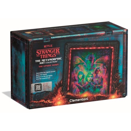 Puzzle 520 pièces - Metamorphic Art Collection - The Uspide Down (Le Monde à l'Envers de Stranger Things). Assemblez 520 pièces pour recréer une scène glaçante avec le Démogorgon, puis exposez-la dans un cadre lumineux fourni. Une fois le puzzle terminé, il suffit d’installer la bande LED, de fixer le tout dans le cadre, puis de l'accrocher au mur pour l'admirer. Le visuel embellit la pièce en journée et, dans l'obscurité, révèle 3 images effrayantes grâce aux jeux de lumière alternée. La boîte du coffret est thématisée pour renforcer l'immersion dans le Monde à l'envers, avec des détails graphiques iconiques.