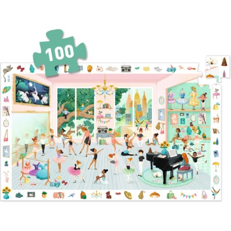 Puzzle 100 pièces - L'école de danse. Puzzle observation de 100 pièces pour découvrir l'école de danse où les jeunes danseurs s'entraînent pour devenir les futures étoiles de l'opéra. L’enfant crée son puzzle puis s’amuse à retrouver dans l’image les éléments de la frise.