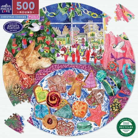 Puzzle rond de 500 pièces : Christmas Cookies. Les puzzles Eeboo sont faits à 90% de cartons recyclés, et imprimés avec des encres végétales pour un impact environnemental limité.